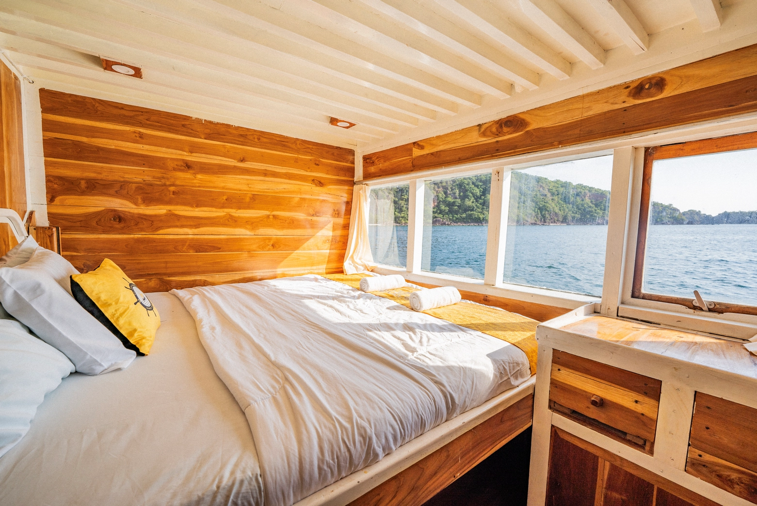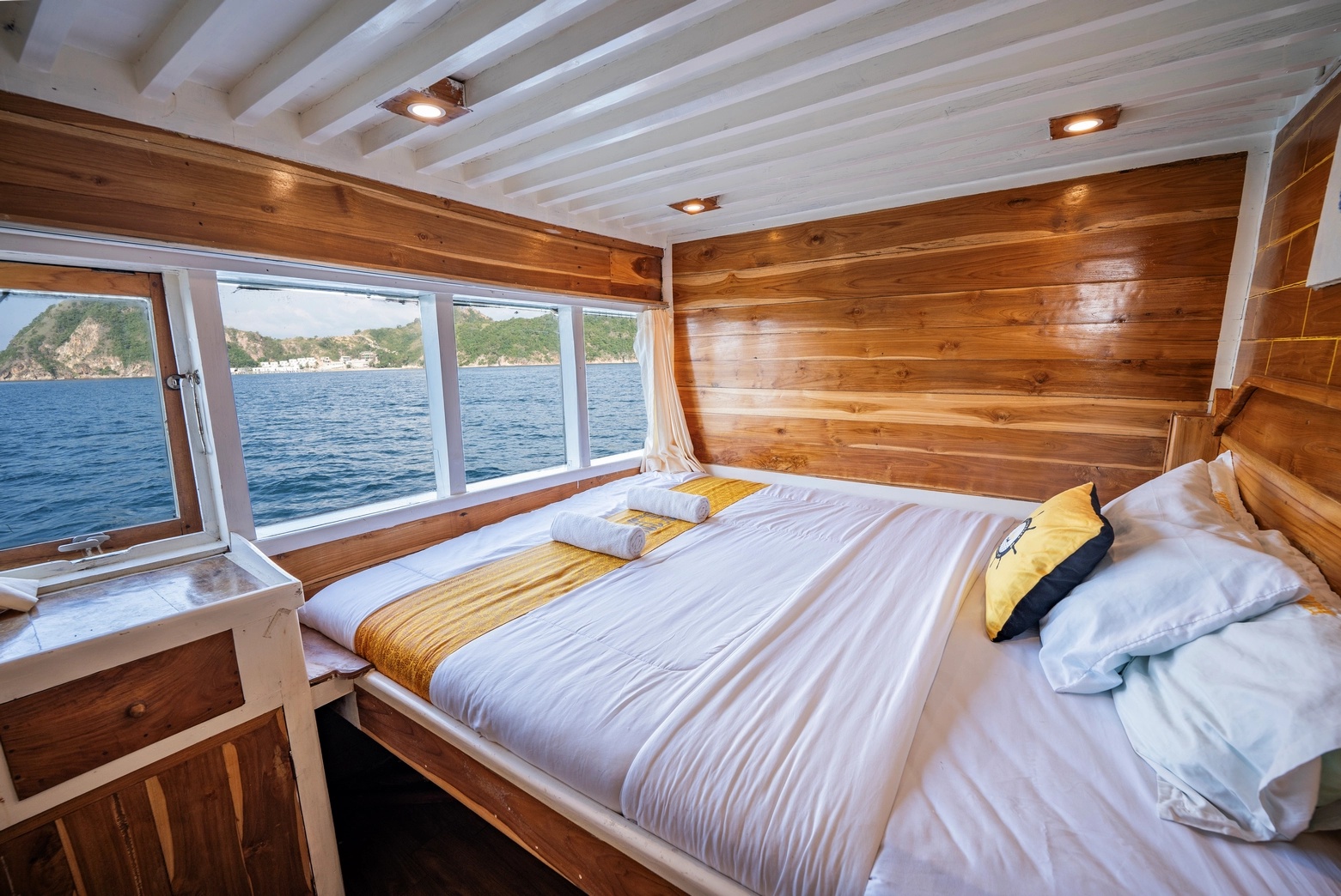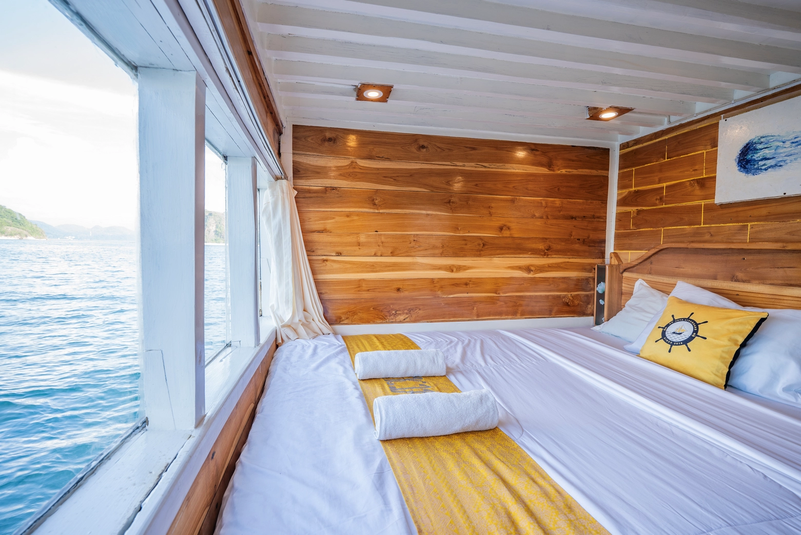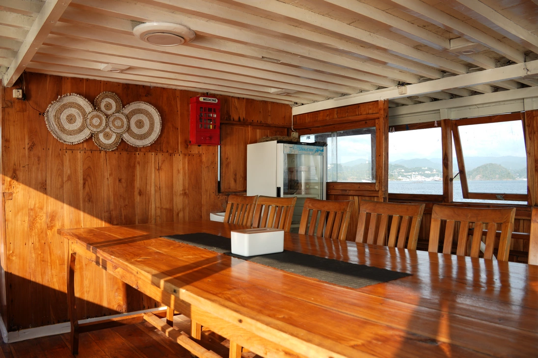 Setiap dari 7 kabin dilengkapi dengan AC dan 7 kamar mandi pribadi, dengan kapasitas total untuk 14 orang.