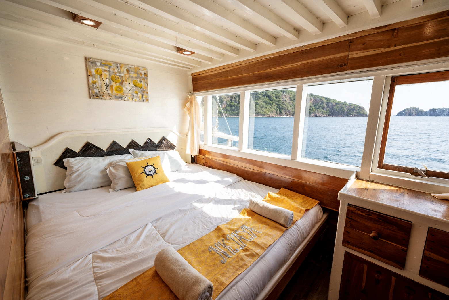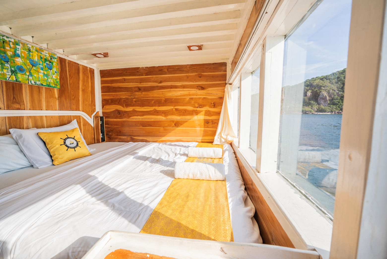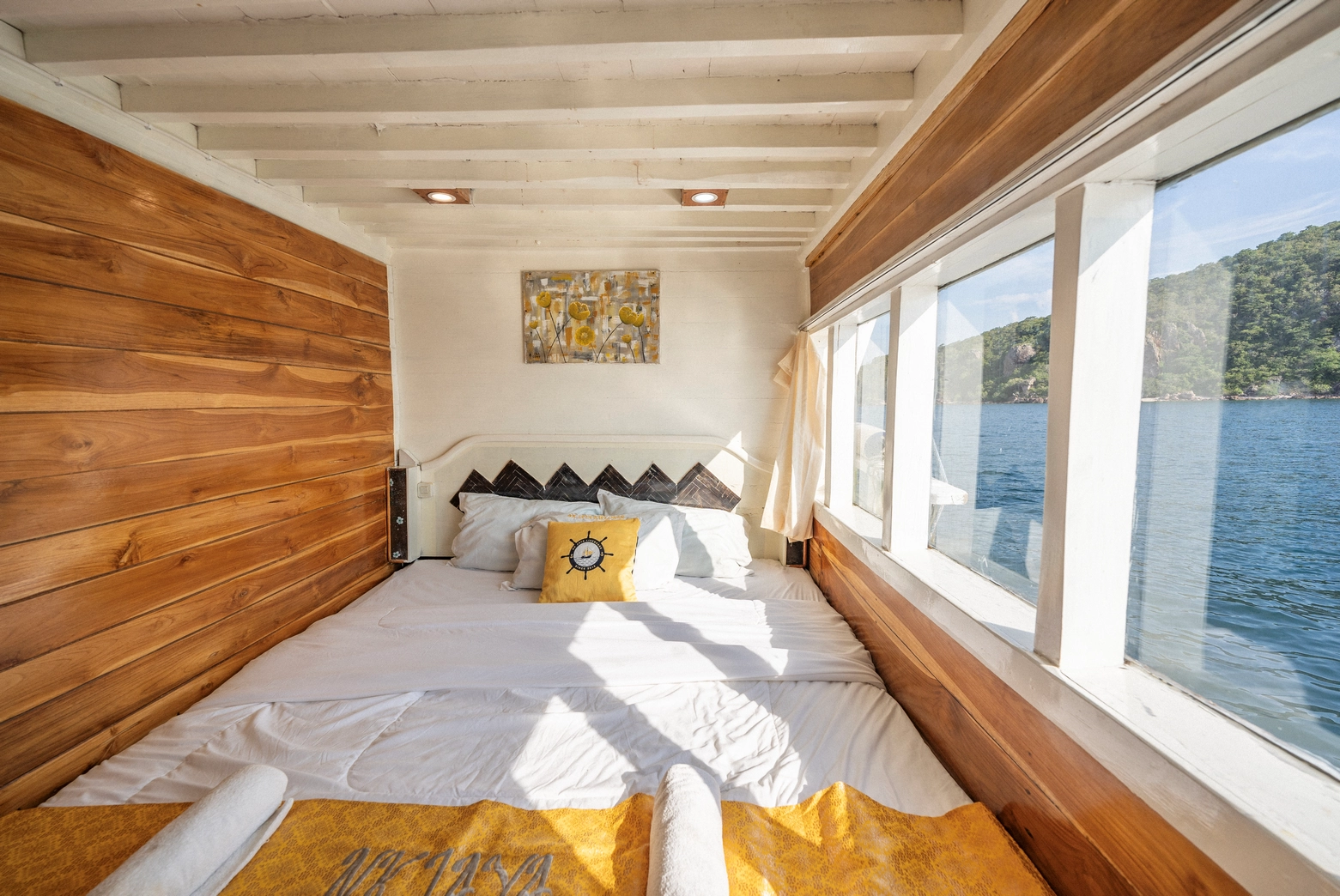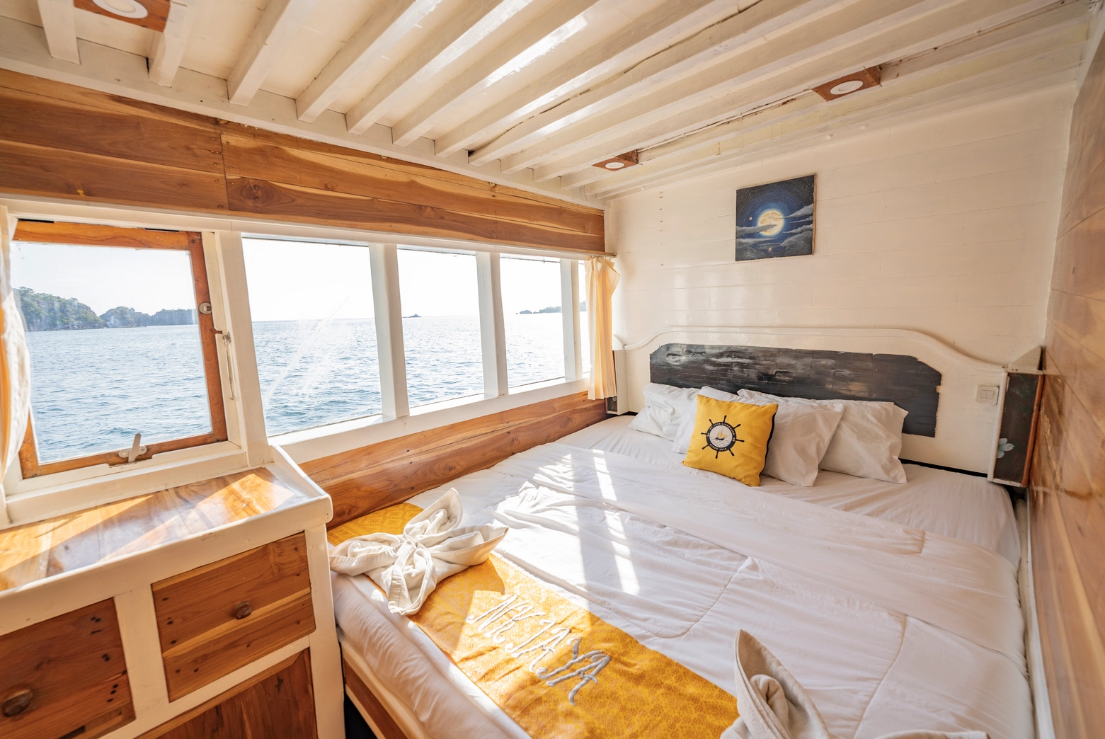 Setiap dari 7 kabin dilengkapi dengan AC dan 7 kamar mandi pribadi, dengan kapasitas total untuk 14 orang.