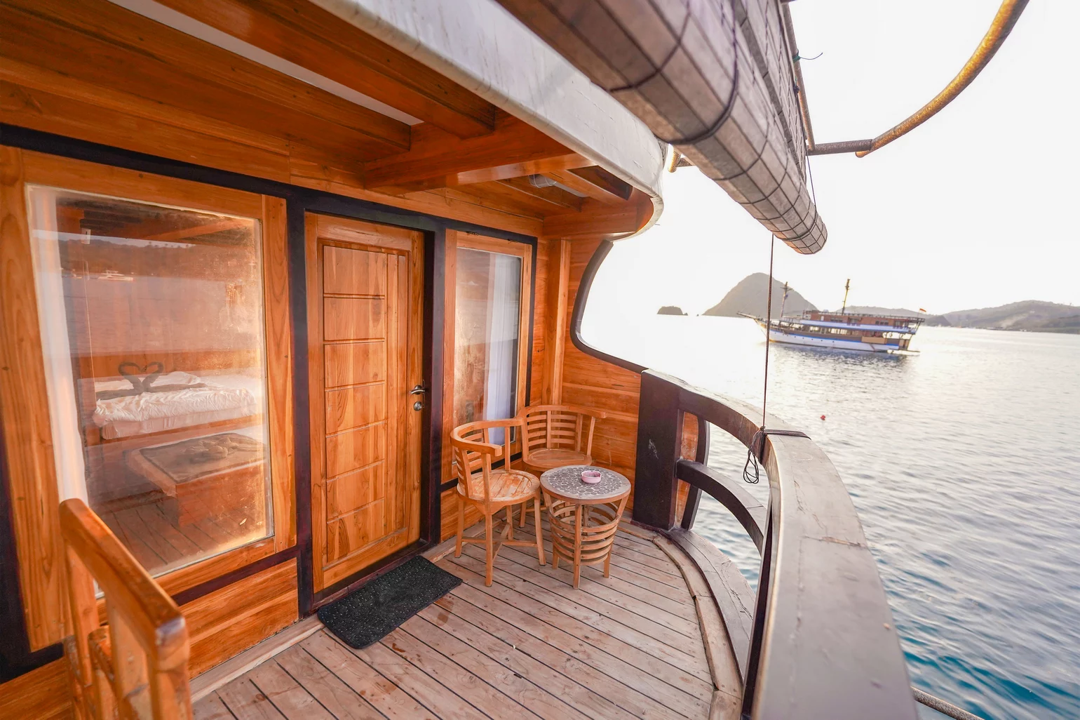 Kabin 2: Queen Bed + 3x Extra Single Bed (untuk 2-5 orang), kamar mandi pribadi, balkon pribadi.