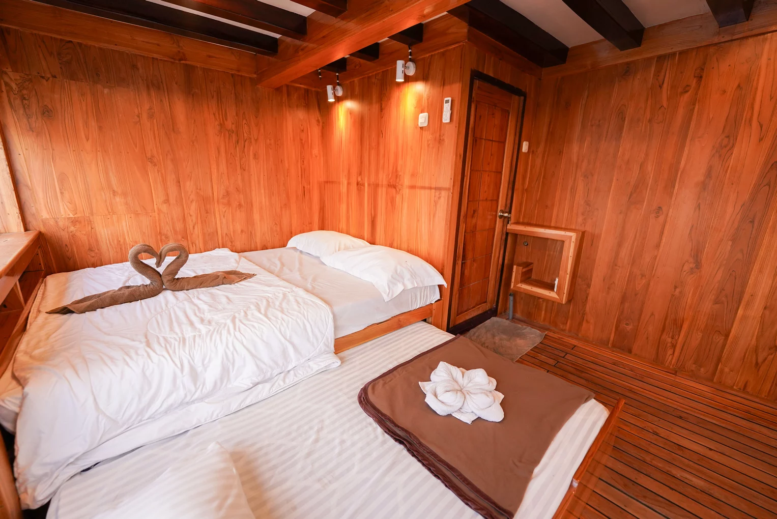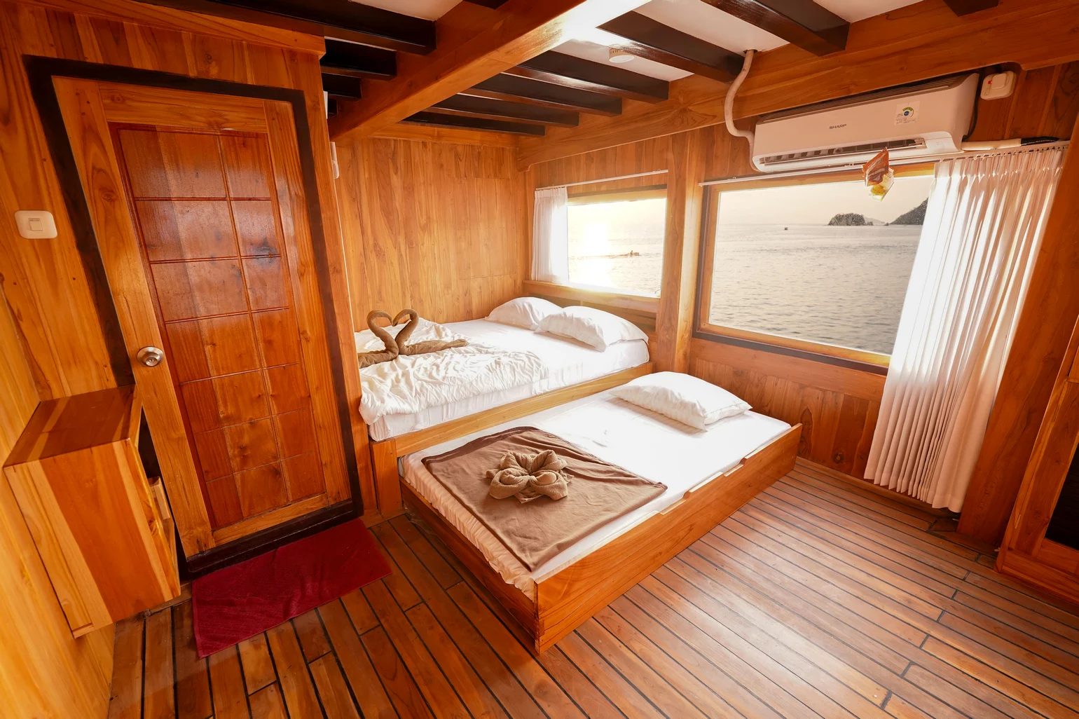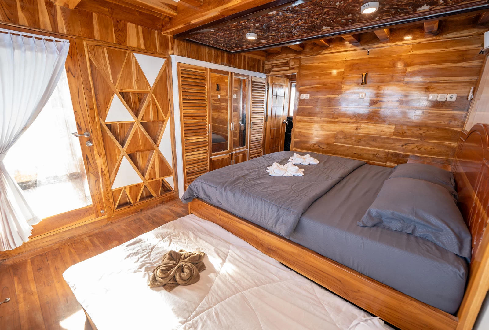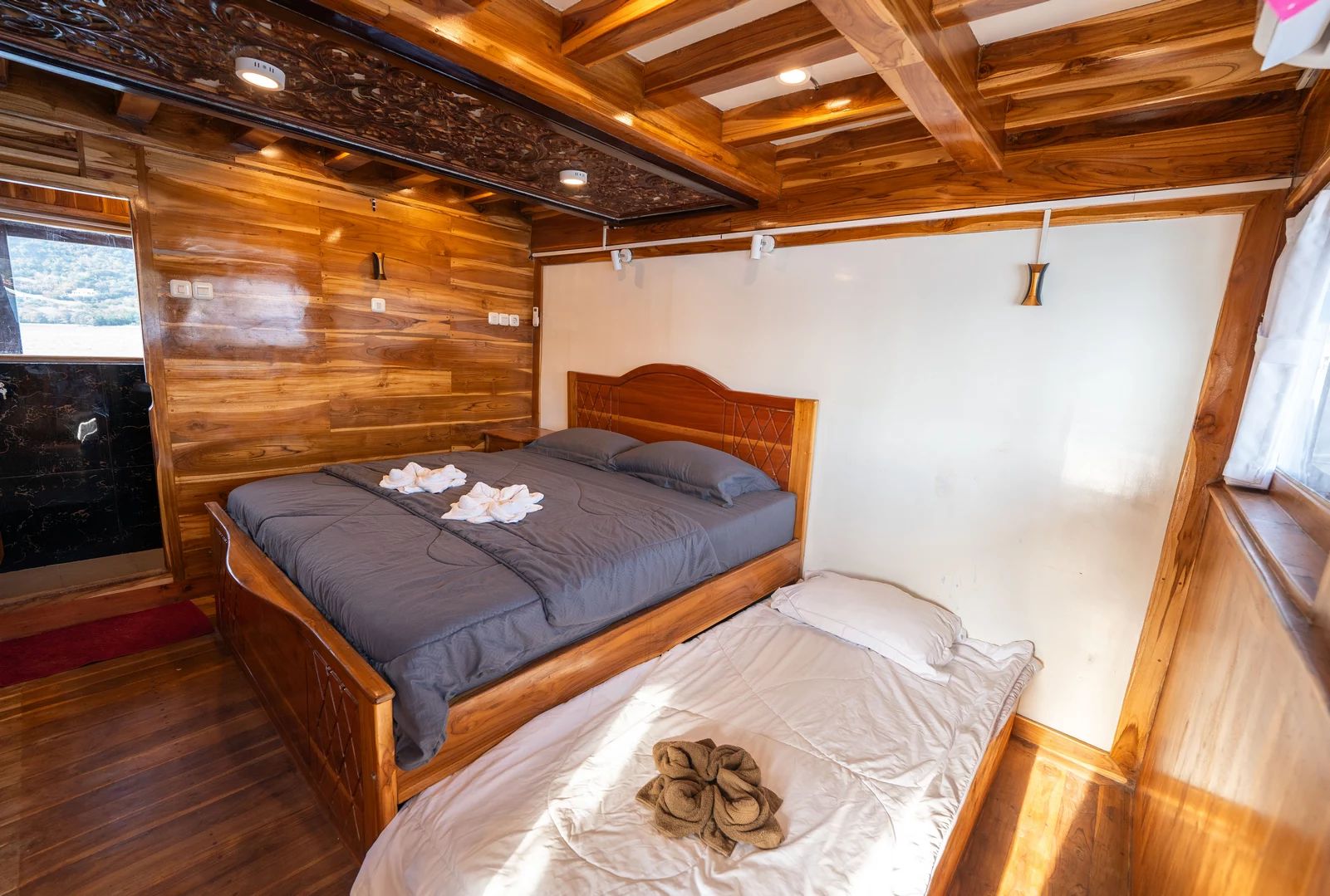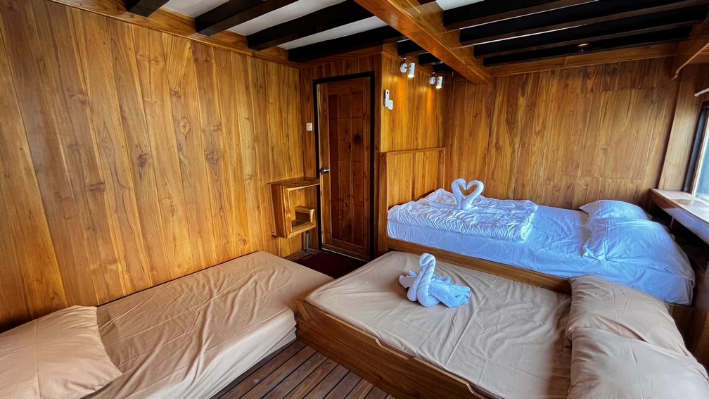 Kabin 1: Queen Bed + 3x Extra Single Bed (untuk 2-5 orang), kamar mandi pribadi, balkon pribadi.