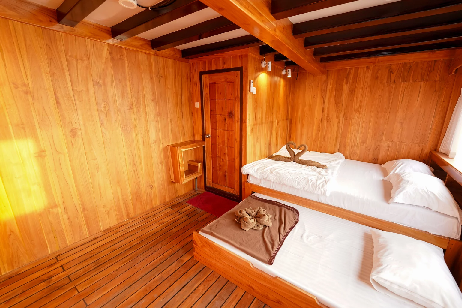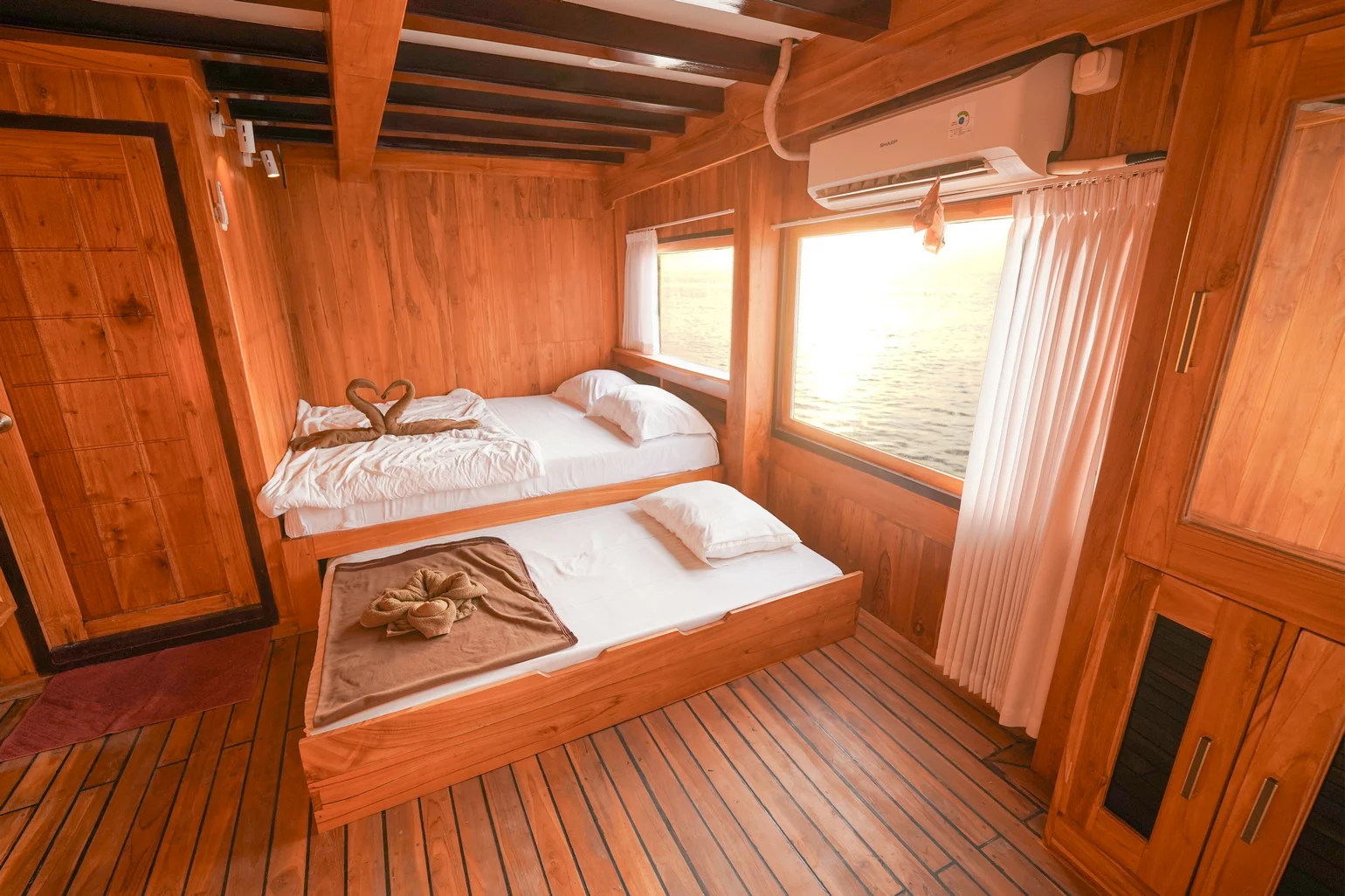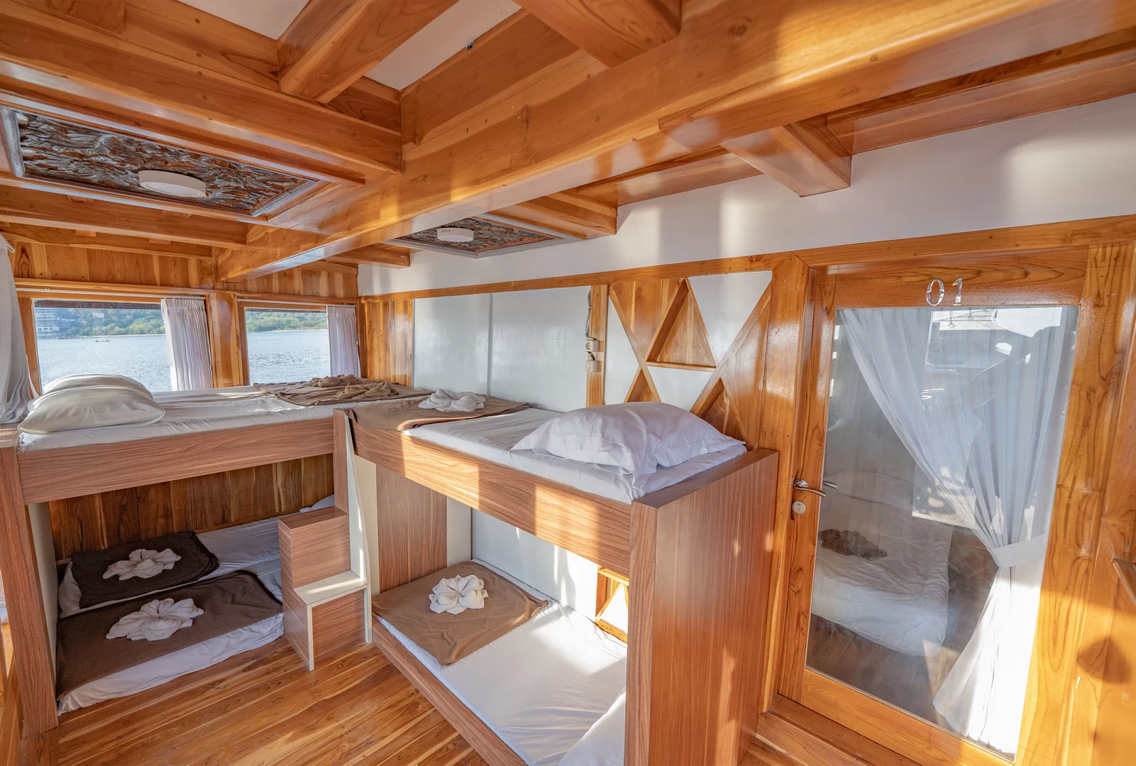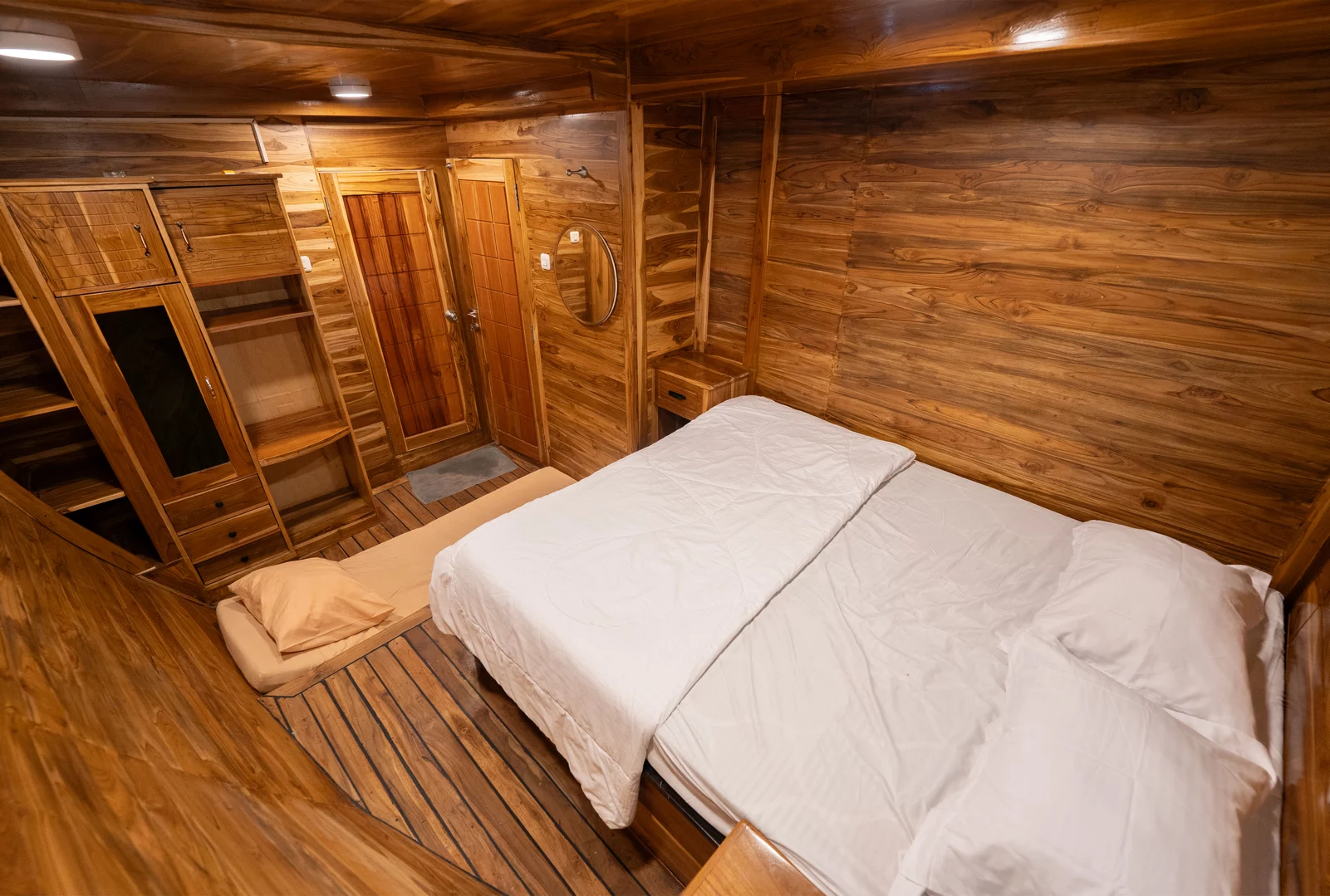 Kabin 1: Queen Bed + 3x Extra Single Bed (untuk 2-5 orang), kamar mandi pribadi, balkon pribadi.