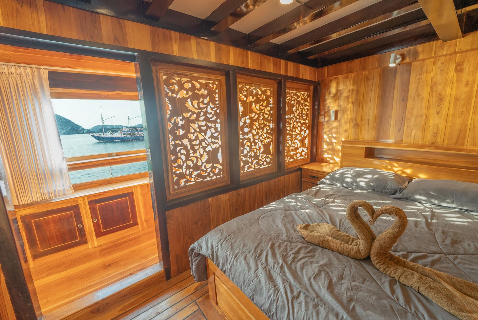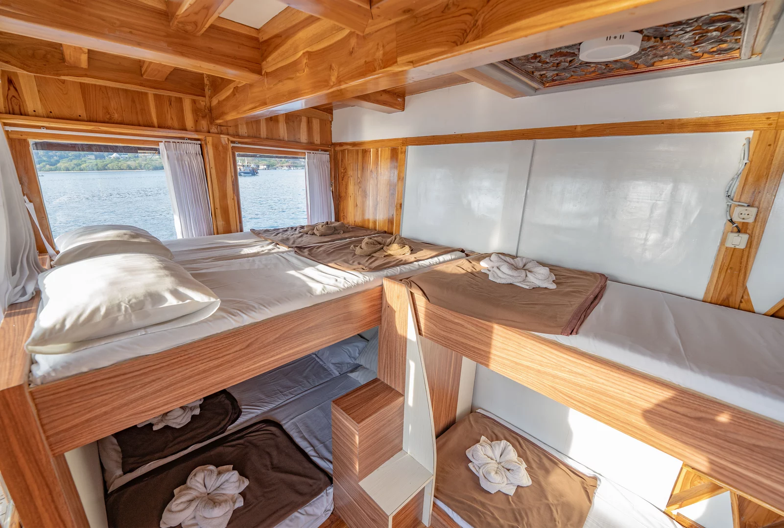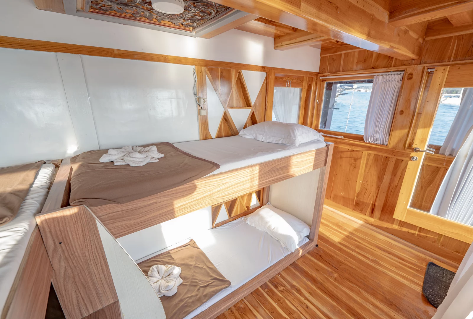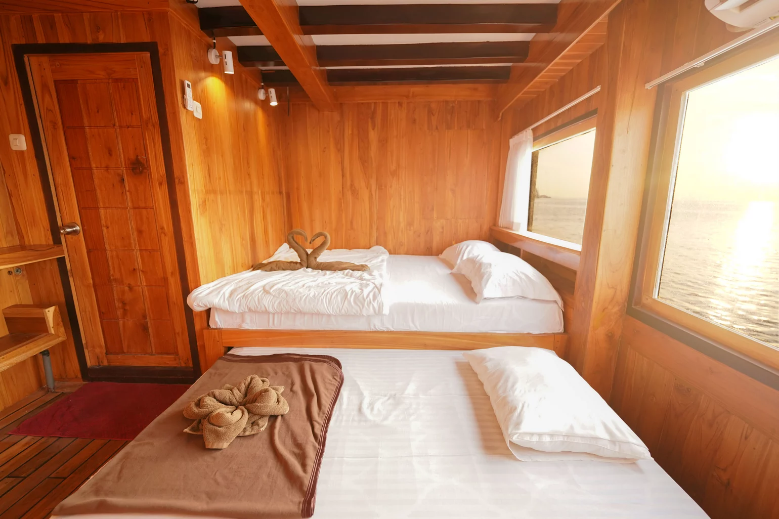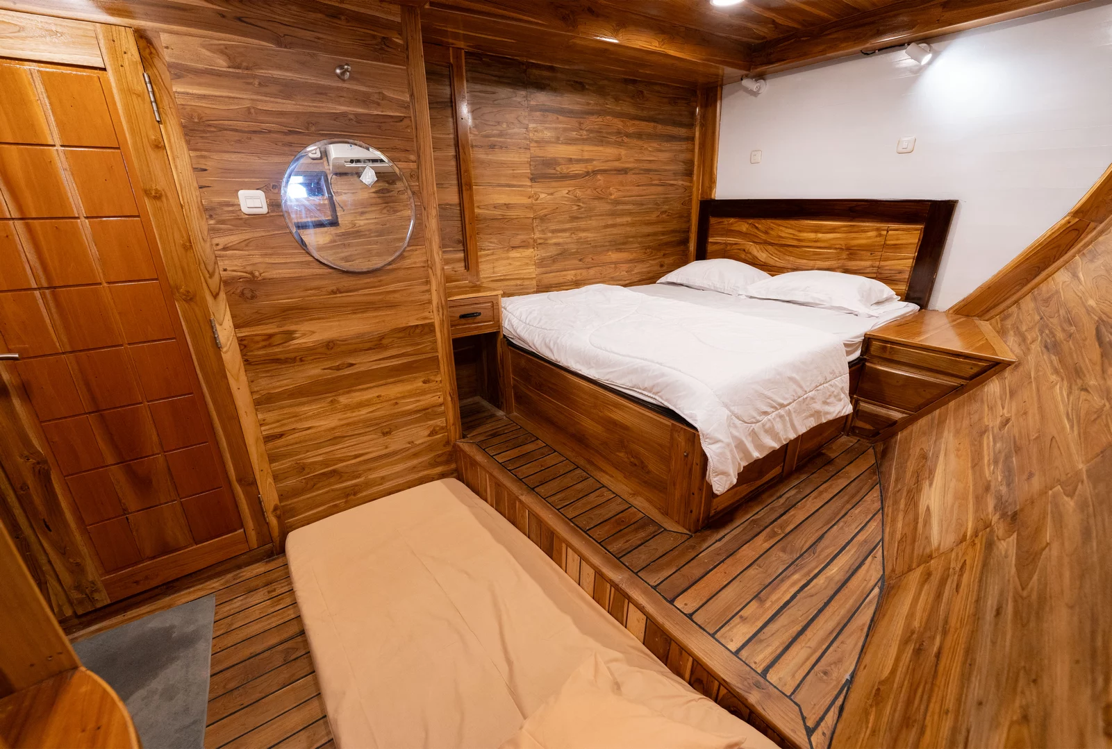Kabin 1: Queen Bed + 3x Extra Single Bed (untuk 2-5 orang), kamar mandi pribadi, balkon pribadi.