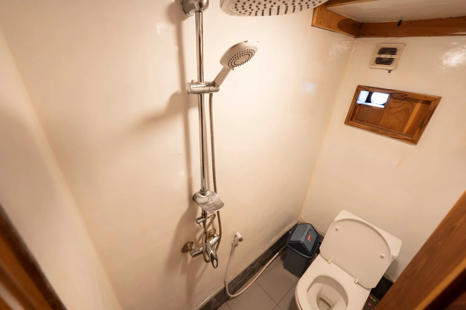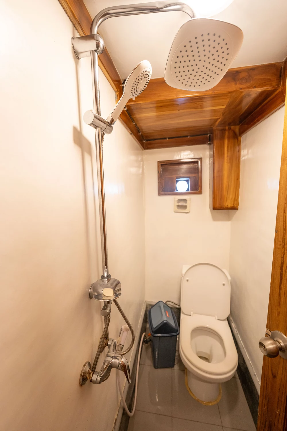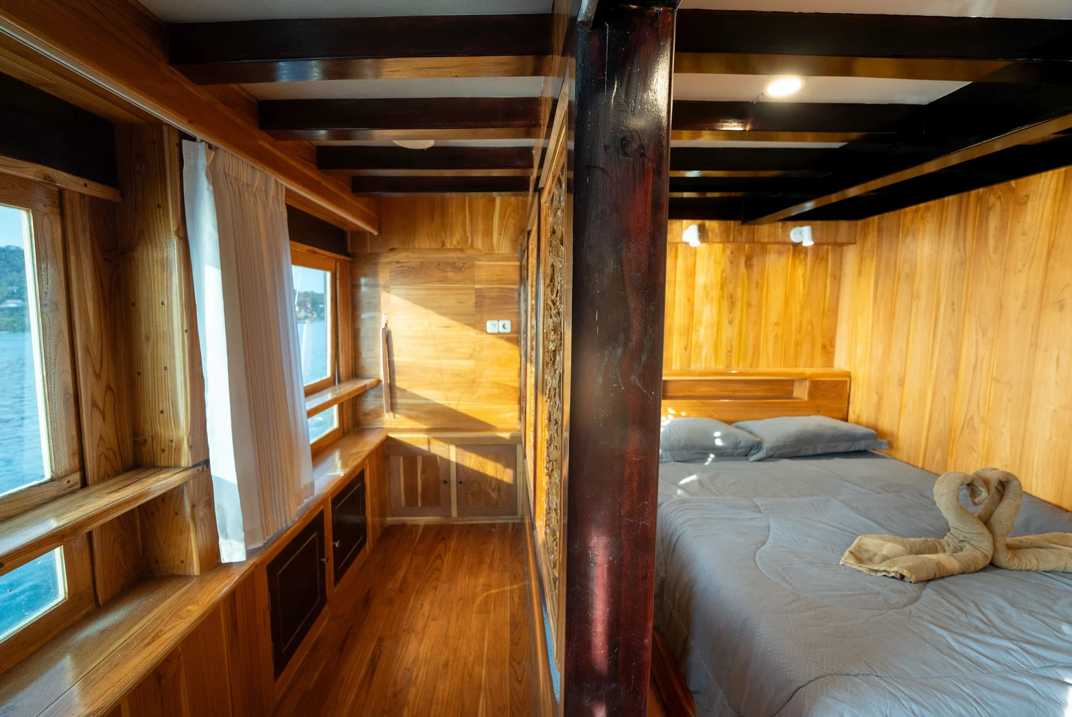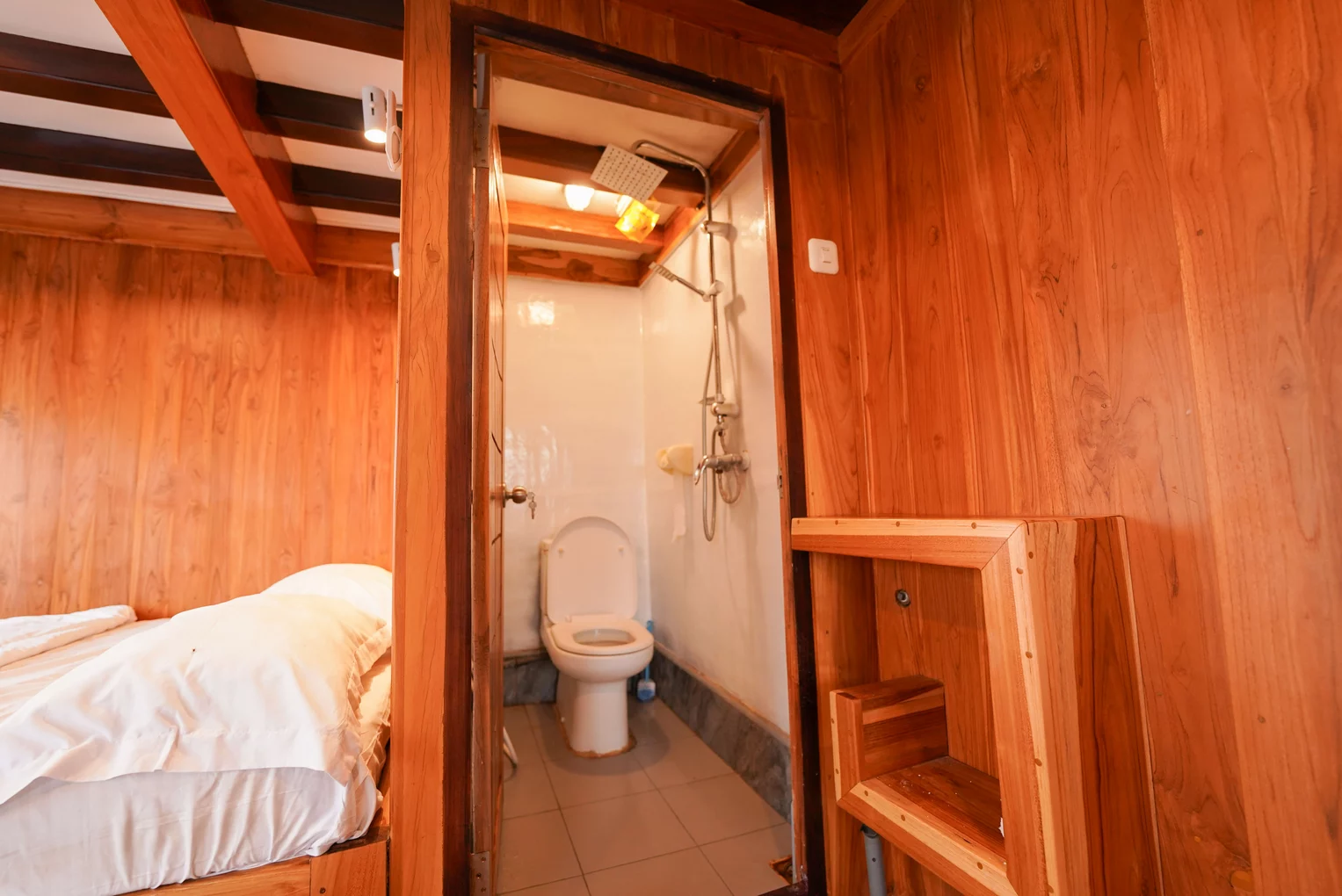 Kabin 1: Queen Bed + 3x Extra Single Bed (untuk 2-5 orang), kamar mandi pribadi, balkon pribadi.